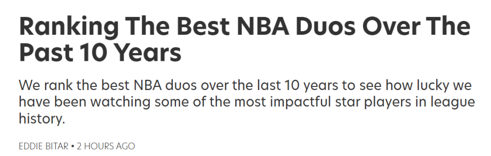 水花兄弟屈居第四!美媒《fadeawayworld》结合最新成就公布近10年双人组TOP10名单,其中哈登与保罗火箭时期组成的“登炮组合”压线入选。
